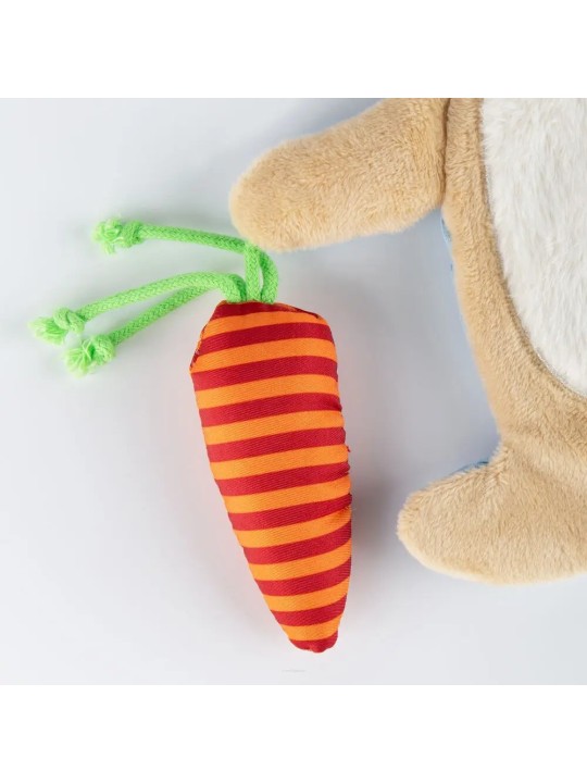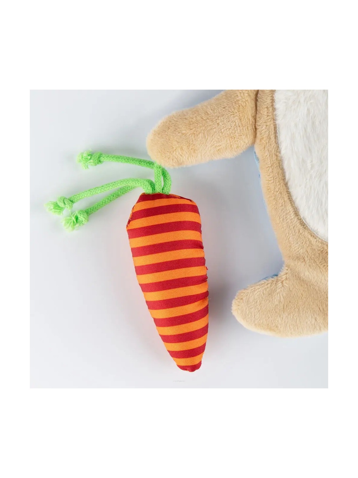 Beżowy króliczek z kolorową marchewką zachwyca maluchy i jest zawsze pod ręką by wspierać prawidłowy rozwój, koić i towarzyszyć w pierwszych przygodach.