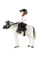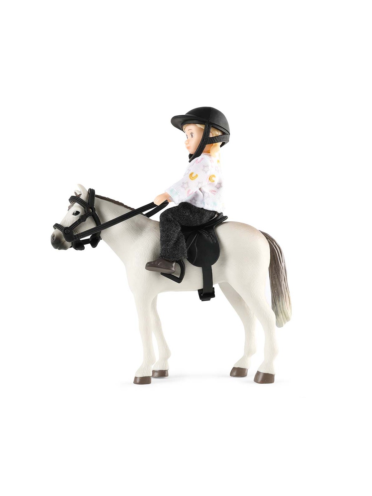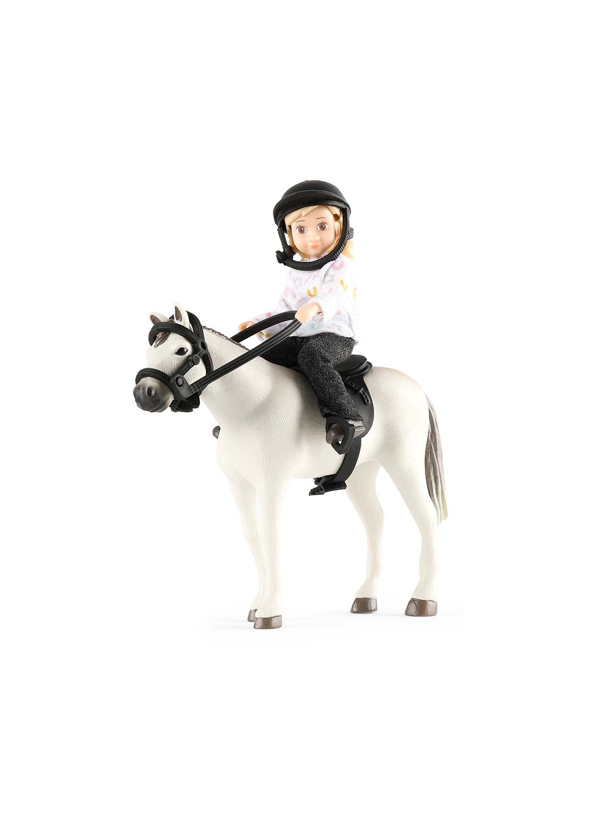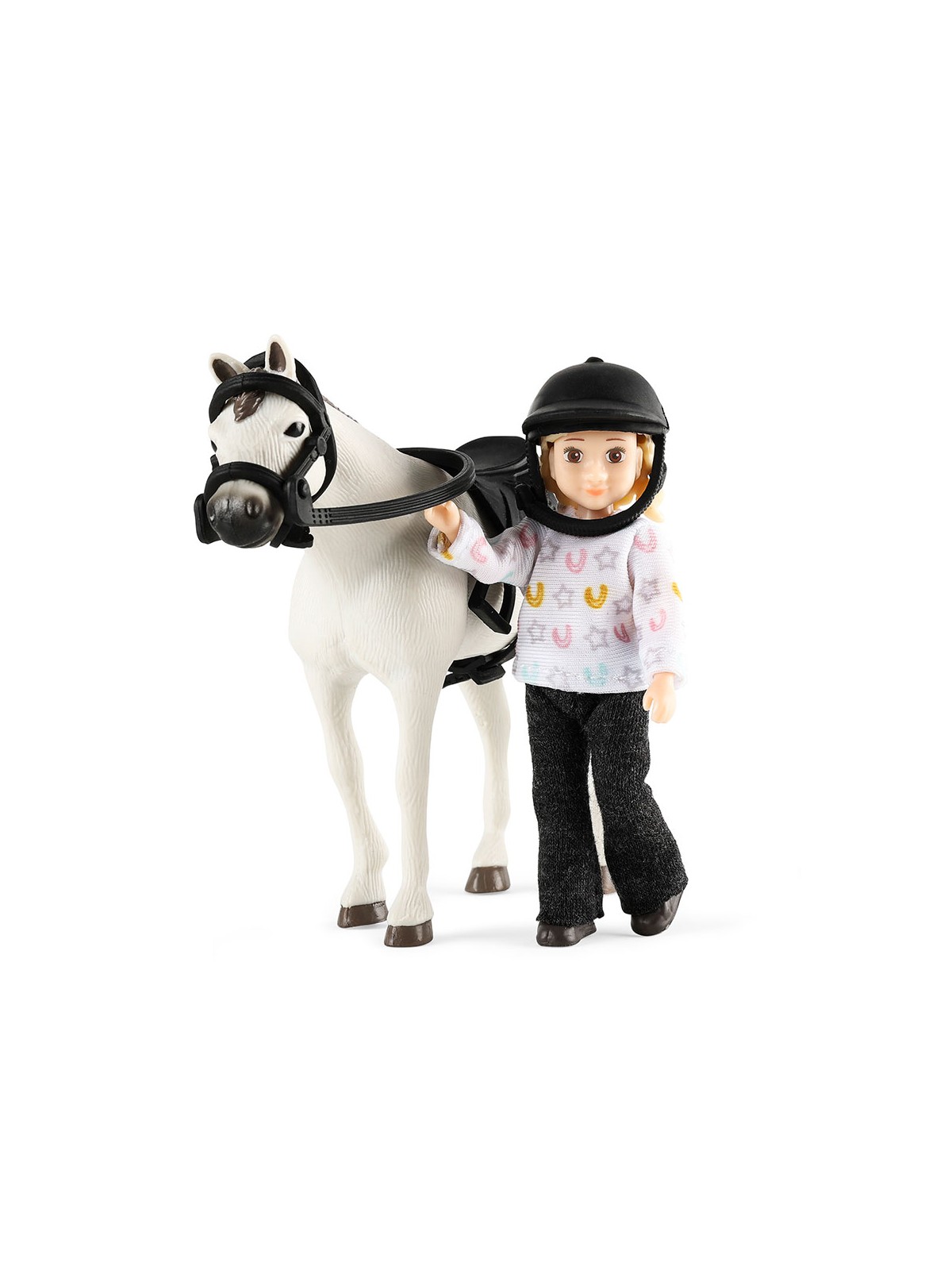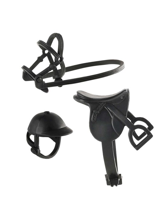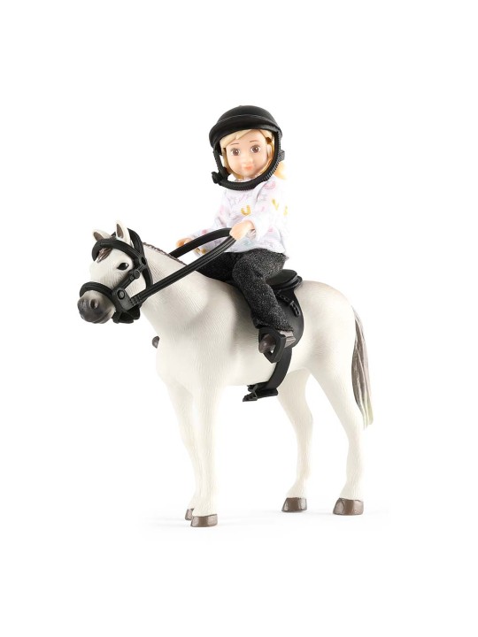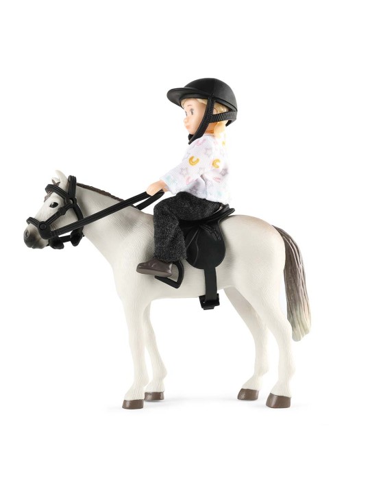 Zestaw z lalką od Lundby. Zachwycająca lalka do domku dla lalek wraz z kaskiem jeździeckim, siodłem i uzdą.