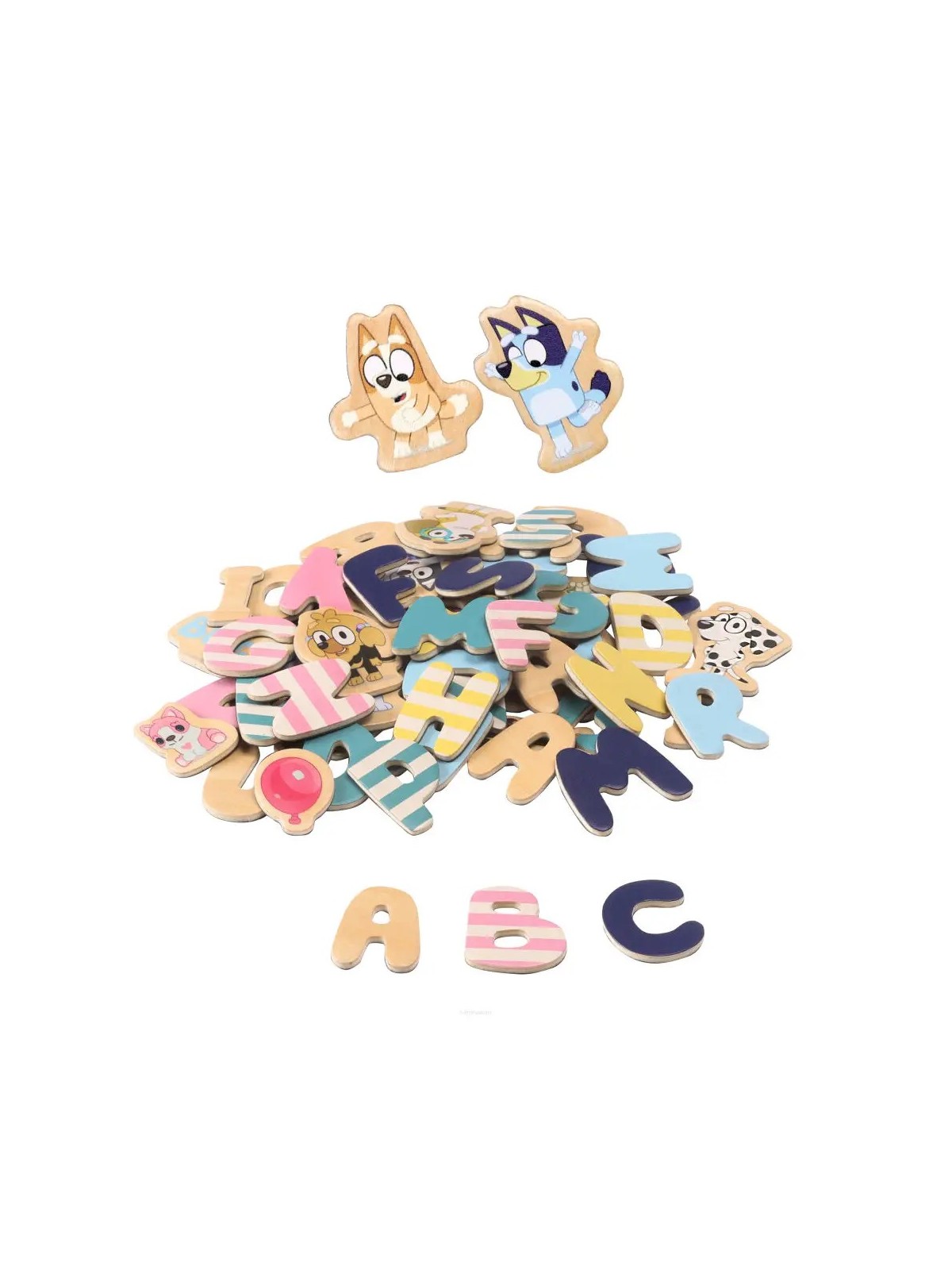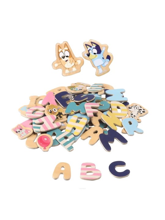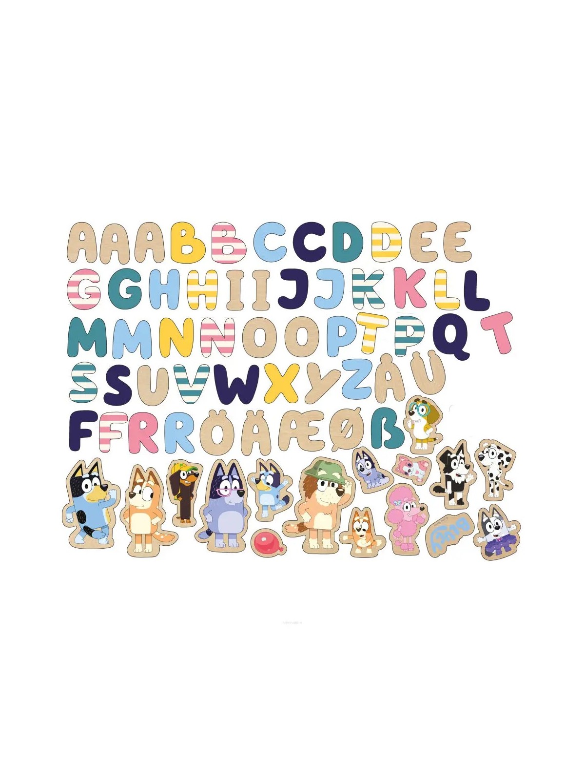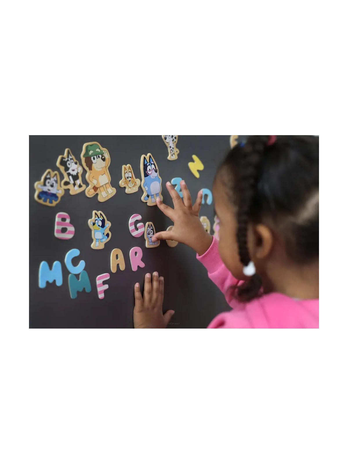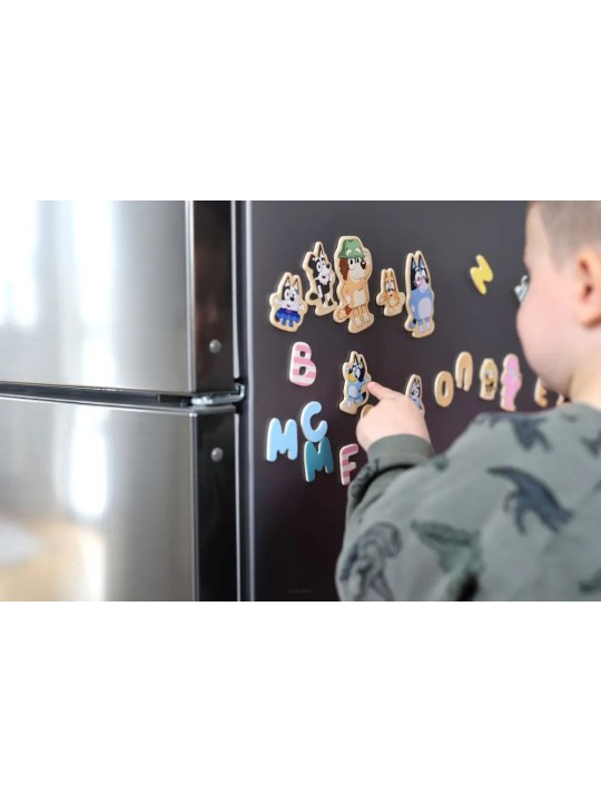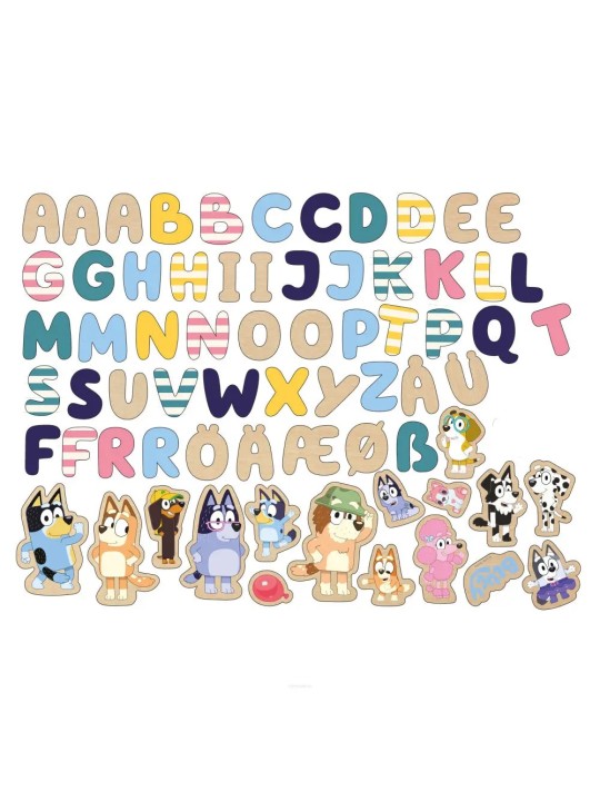 Zestaw zawiera 53 litery i 17 figurek przedstawiających oryginalne postacie z kreskówki Bluey.