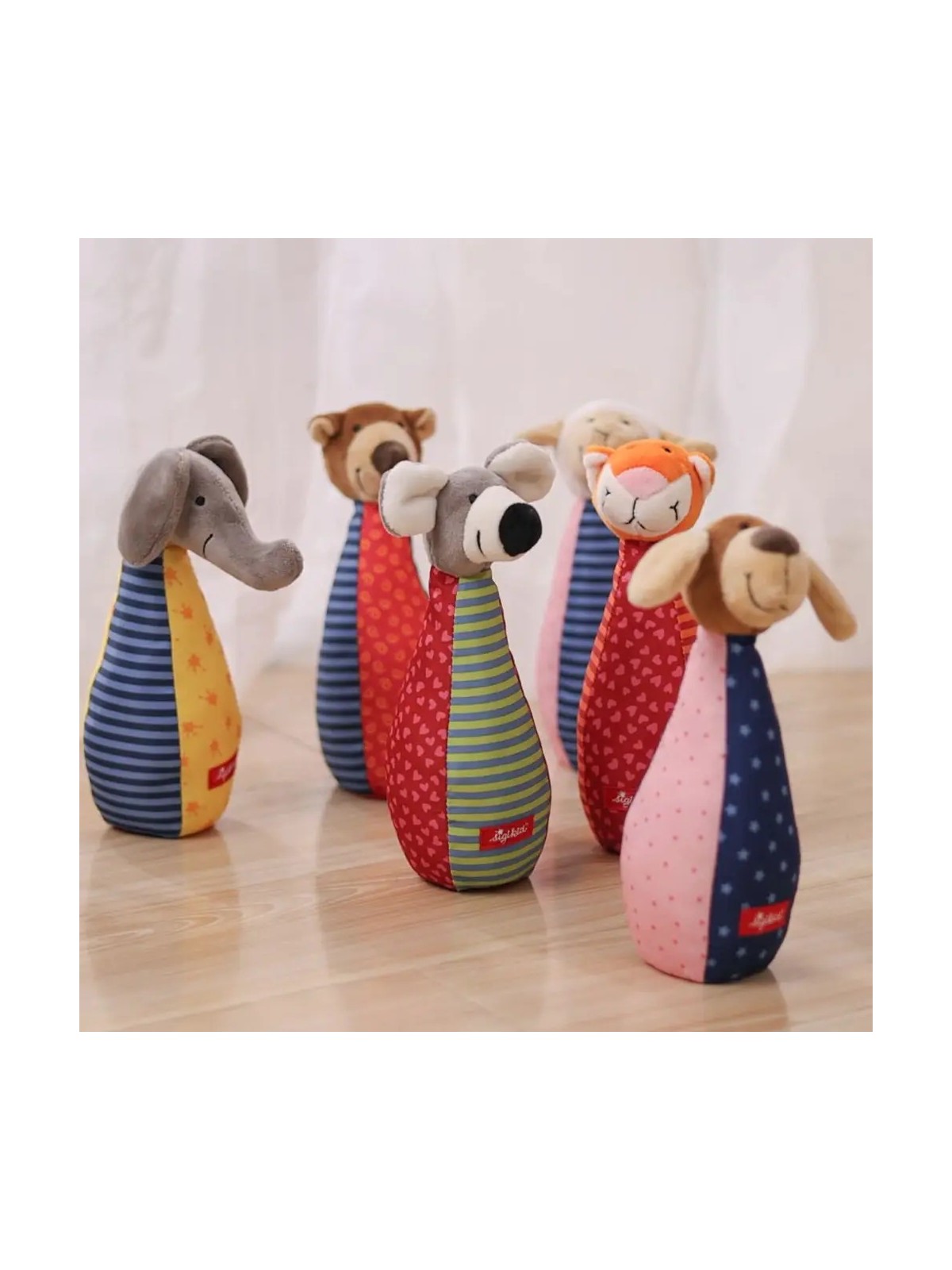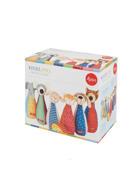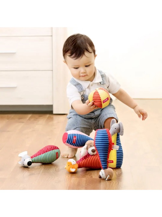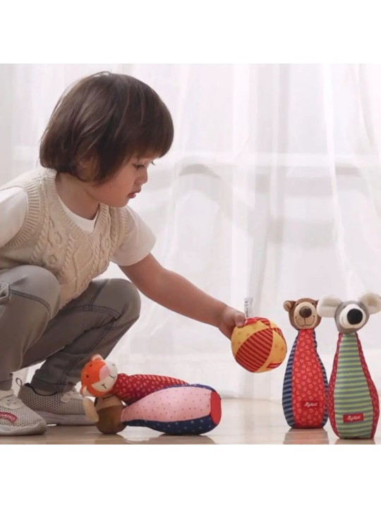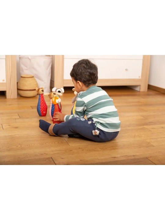Ta rozwojowa zabawka zapobiega nudzie i zachęca dzieci do aktywnego chwytania, czucia i słuchania. Patchworkowe kręgle i piłeczka zapraszają do eksplorowania, są łatwe do uchwycenia i trzymania przez małe rączki. Ich różnorodne tkaniny i przyjazne haftowane buźki zwierzątek oferują maluchom nowe wrażenia wizualne i dotykowe.