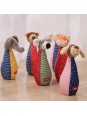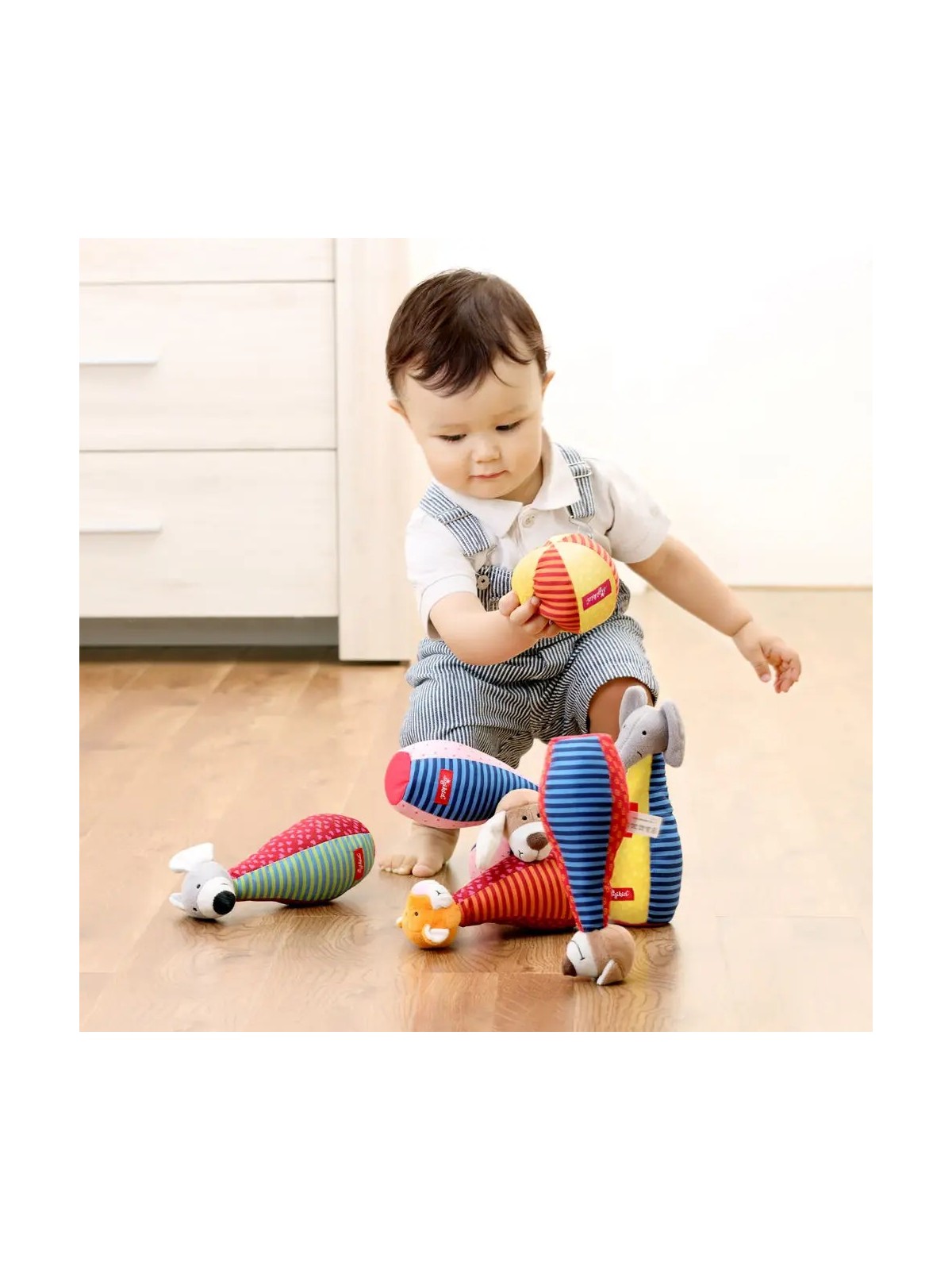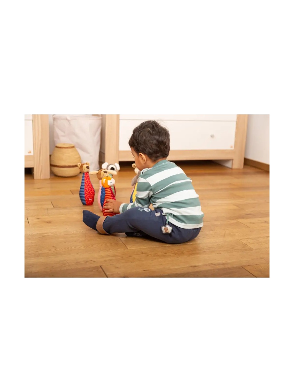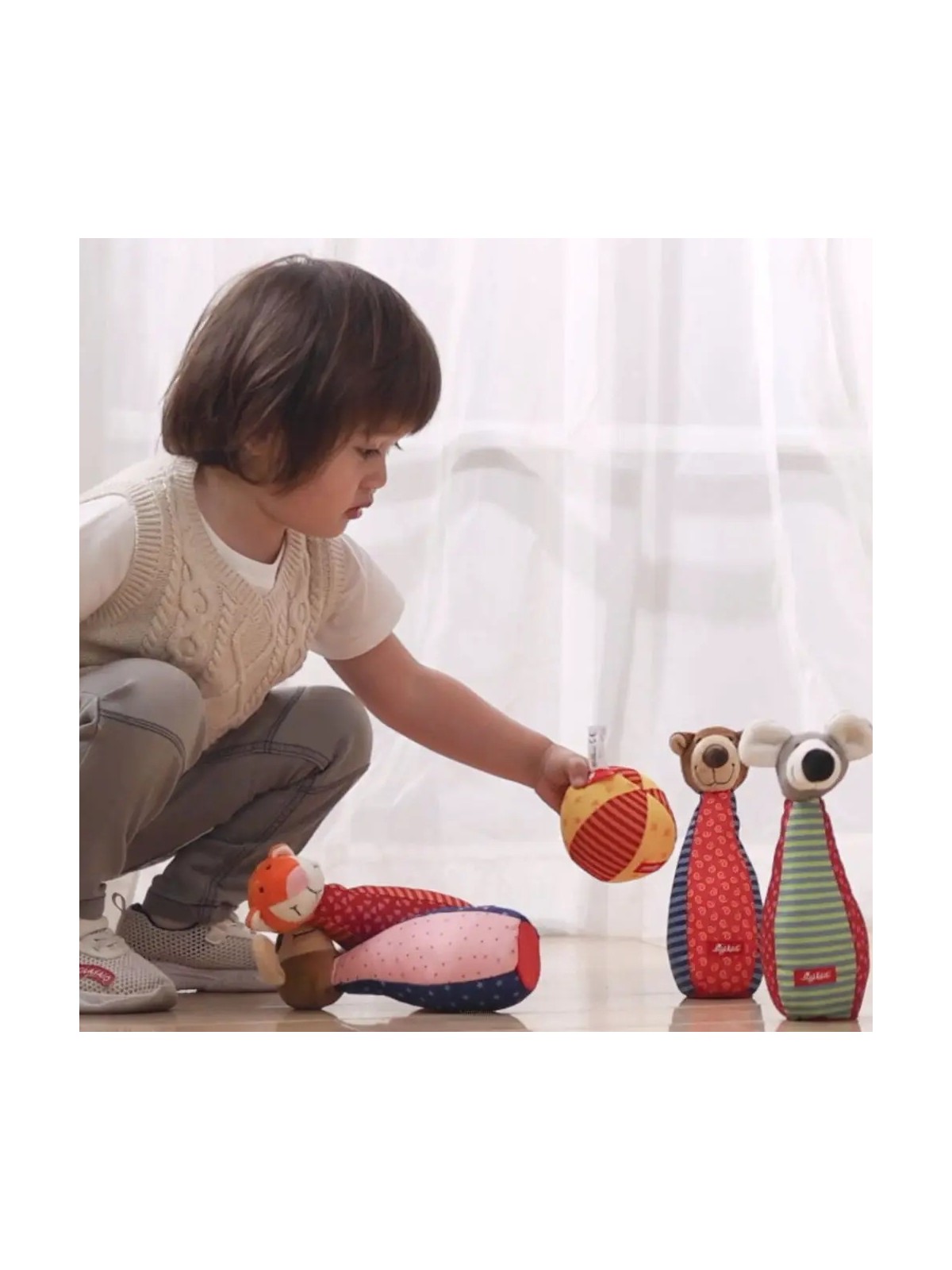 Ta rozwojowa zabawka zapobiega nudzie i zachęca dzieci do aktywnego chwytania, czucia i słuchania. Patchworkowe kręgle i piłeczka zapraszają do eksplorowania, są łatwe do uchwycenia i trzymania przez małe rączki. Ich różnorodne tkaniny i przyjazne haftowane buźki zwierzątek oferują maluchom nowe wrażenia wizualne i dotykowe.